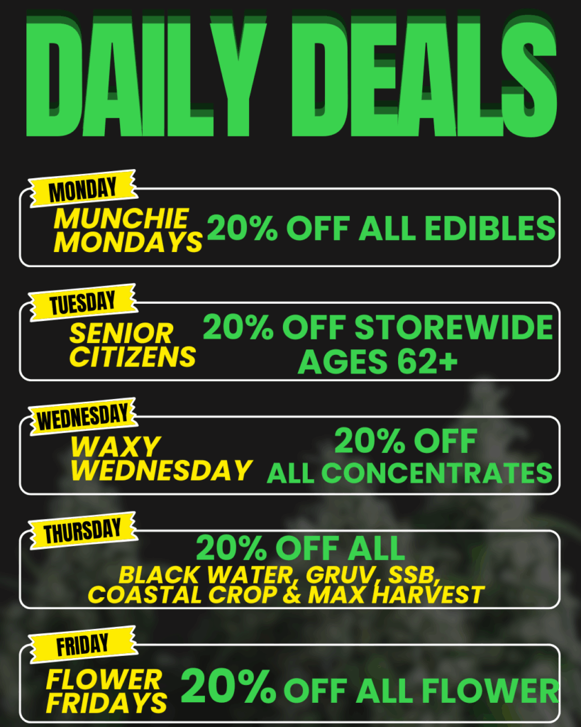 Buy 5, Get 1 for 1¢ must be of equal or lesser value. (3.5G Flower, 1G Concentrate, 100MG Edible)
